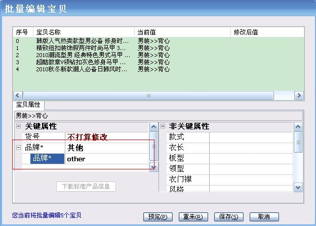 对于第1、2种情况,采用批量调整属性方法,下面有图文示例;我们也专门录制了一部视频,专门讲解如何批量调整宝贝属性—>点击即可下载观看。