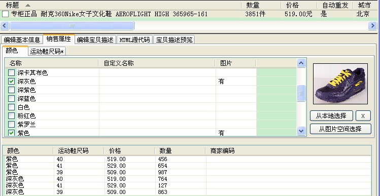 淘宝助理不能批量销售属性的修改价格(数量),软件里面提供这样的功能,当然这类宝贝部分宝贝类目才有,比如典型的有鞋类: