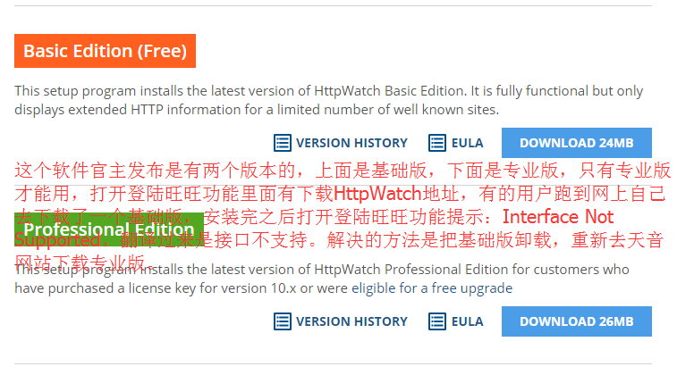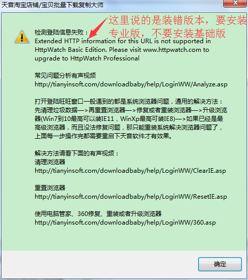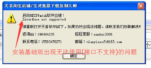 这个软件官方发布是有两个版本的,上面是基础版,下面是专业版,只有专业版才能用,打开登陆旺旺功能里面有下载HttpWatch地址,有的用户跑到网上自己去下载了一个基础版,安装完之后打开登陆旺旺功能提示:Interface Not Supported。翻译过来是接口不支持。解决的方法是把基础版卸载,重新去天音网站下载专业版。