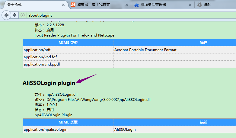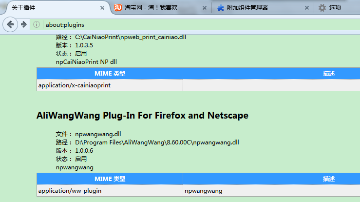 在浏览器地址栏输入“about:plugins”,可以看到插件的详细信息