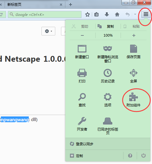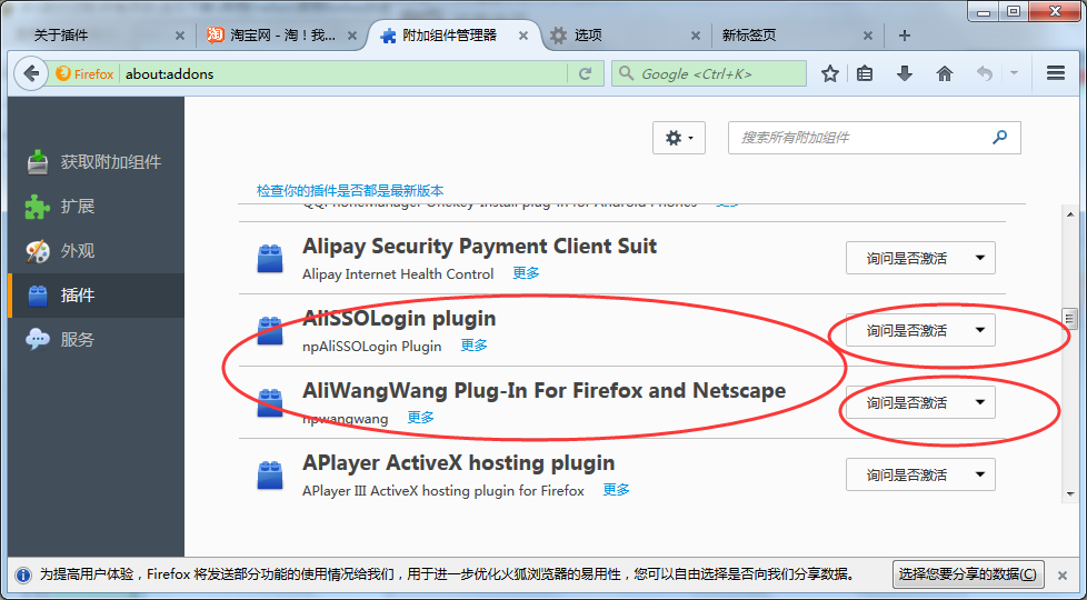 快捷登陆需要旺旺安装目录下的两个插件,浏览器会自动安装。可以点右上角“打开菜单—>附加组件—>插件”查看。