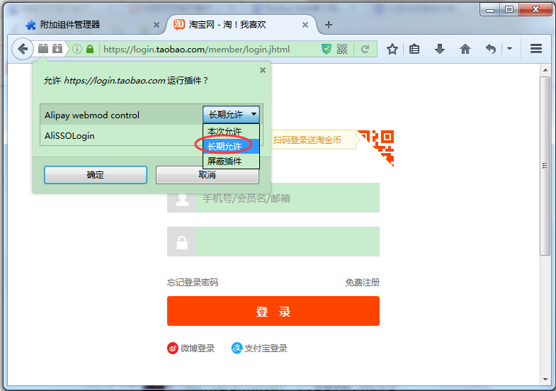 先在电脑里面最少打开一个千牛或者买家版旺旺,打开火狐浏览器,在地址栏输入淘宝的登陆网页“login.taobao.com”,弹出允许网站运行插件的提示,两个插件都选择长期允许,再点确定,刷新页面就可以快捷登陆了。