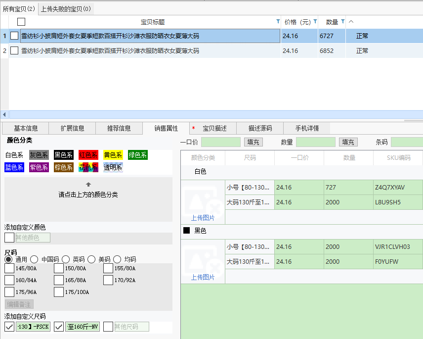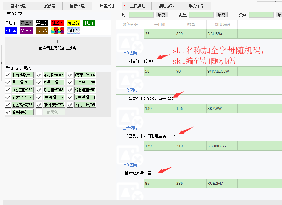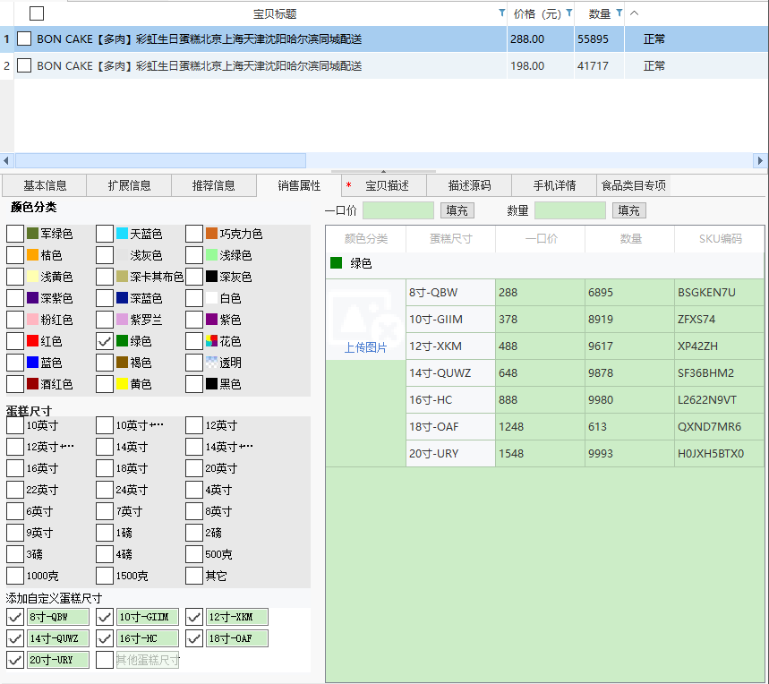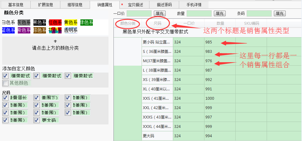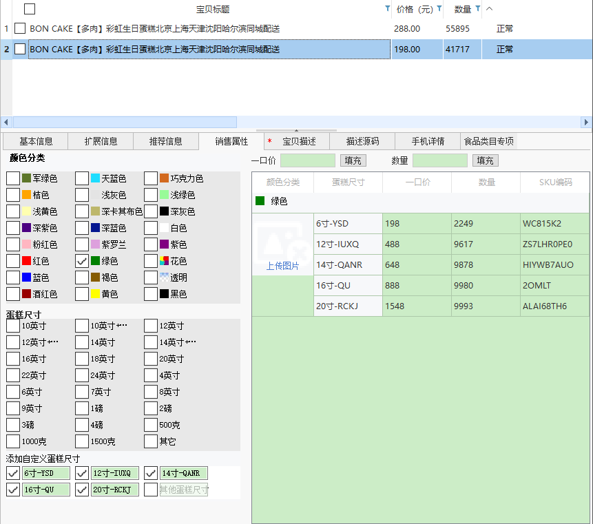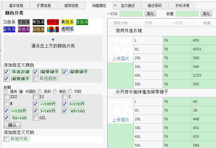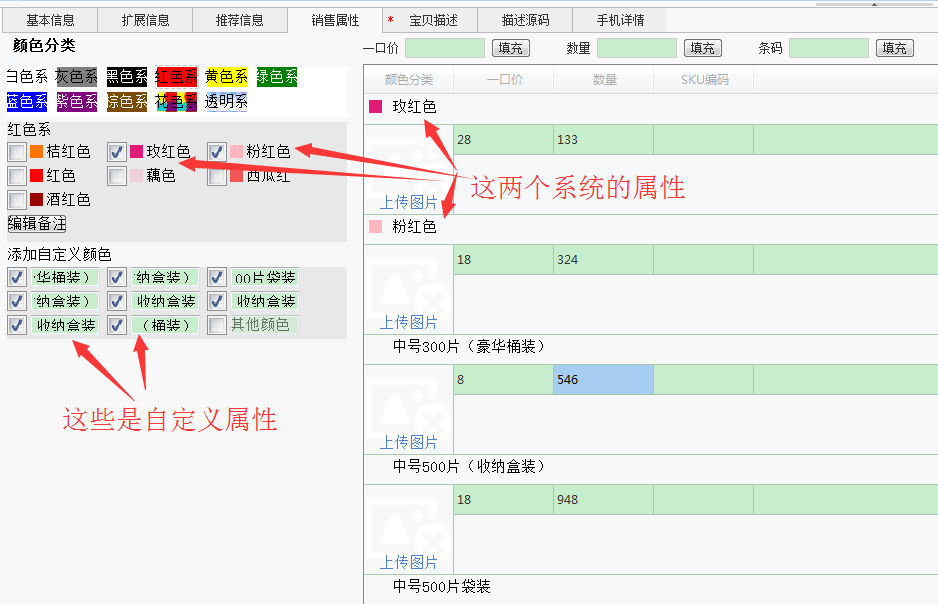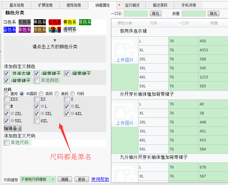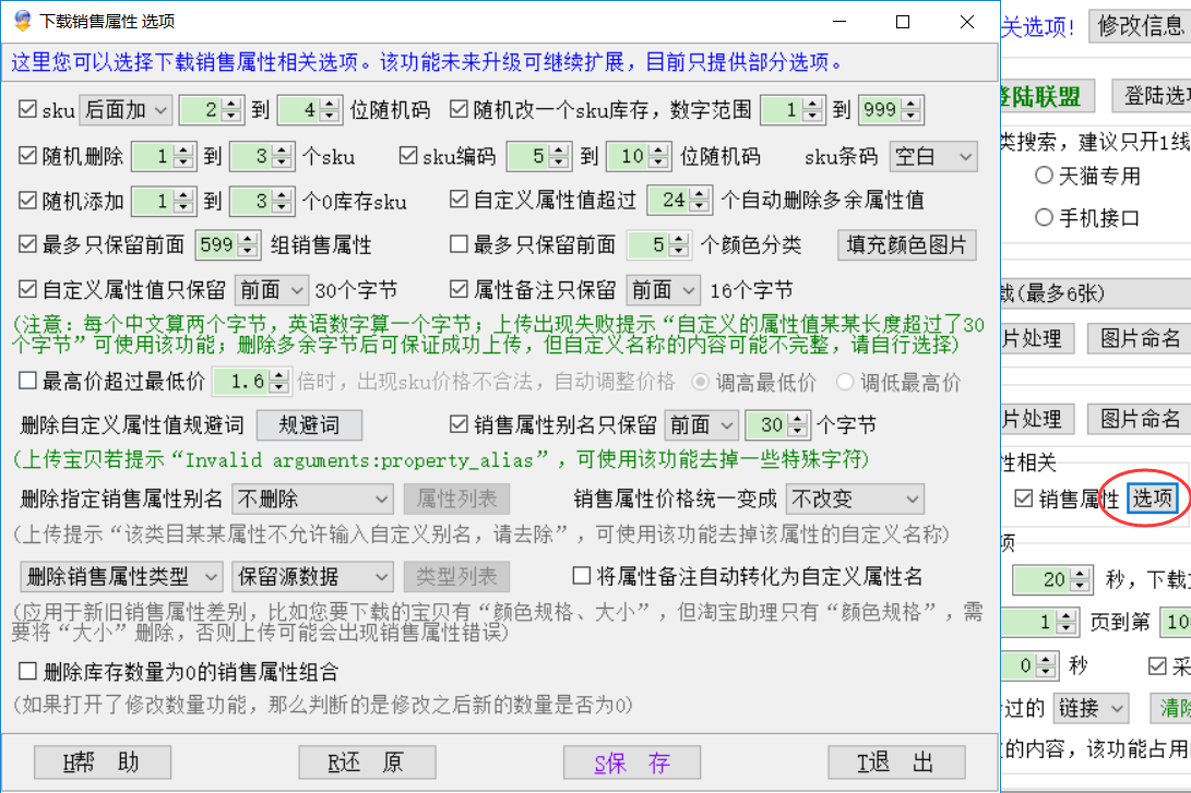 上面是淘宝数据包制作的销售属性选项,下面是上传软件的选项