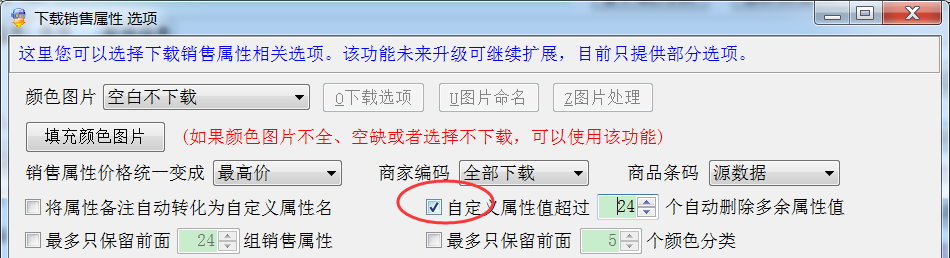 ▲自定义属性值超过24个自动删除多余属性值:淘宝规定,自定义属性值不能超过24个,详细请看下例子,默认勾选;