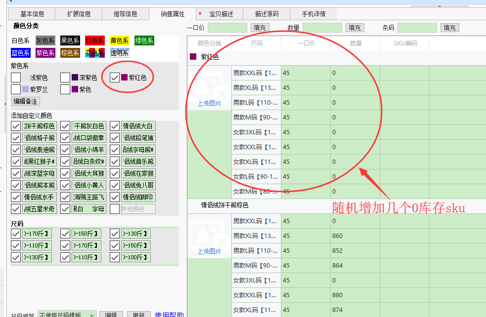 只有一部分销售属性组合数量为0对上传宝贝没有影响,但是不能全部都为0,相当于没有库存,无法上传。