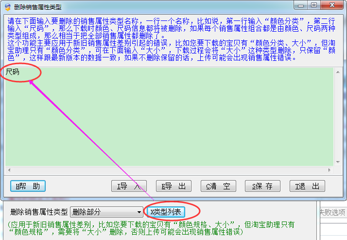 ▲删除销售属性类型:应用于新旧销售属性差别,比如您要下载的宝贝有“颜色规格、大小”,但淘宝助理只有“颜色规格”,需要将“大小”删除,否则上传可能会出现销售属性错误;