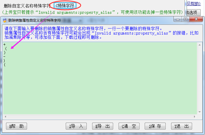 ▲删除销售属性自定义名称特殊字符:销售属性自定义名称含有特殊字符可能会出现“Invalid arguments:property_alias”的报错,比如加减乘除号等,可添加在里面,下载过程即可删除;
