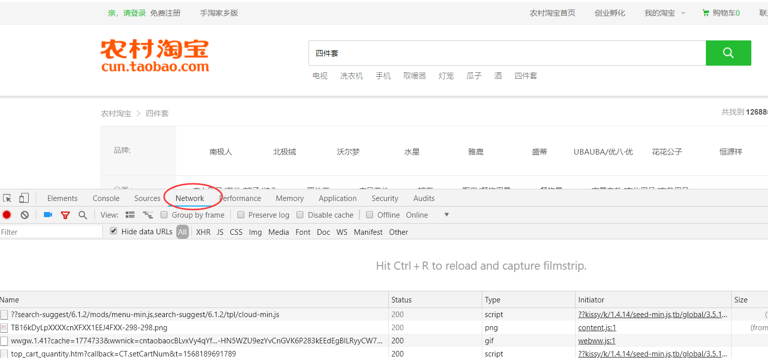 —>第一步:点击“村淘搜索”,按F12打开“开发者工具”,点击Network;