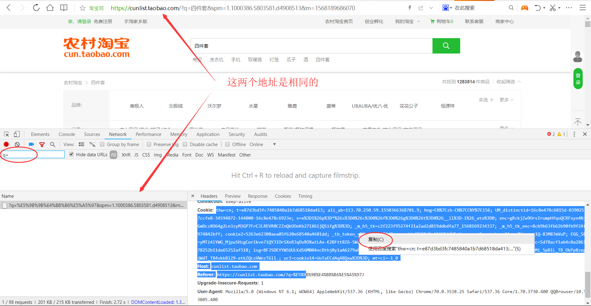—>第二步:刷新一次页面(有滑块要滑成功),Filter框输入【q=】,找到跟网址一样的,选中,右边Headers拉下来,在Request Headers里面找到cookie,选中cookie的整段内容右键复制,然后到当前窗口点击“粘贴继续”;