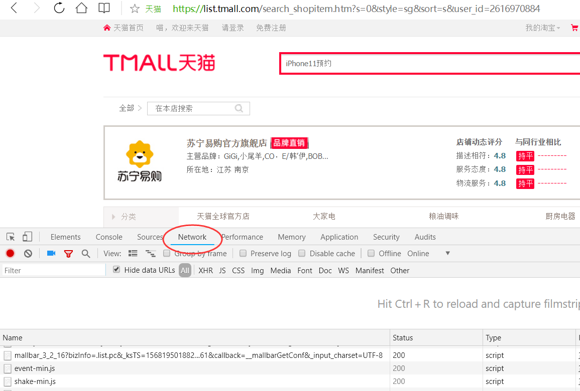 —>第一步:点击“天猫搜索”,按F12打开“开发者工具”,点击Network;