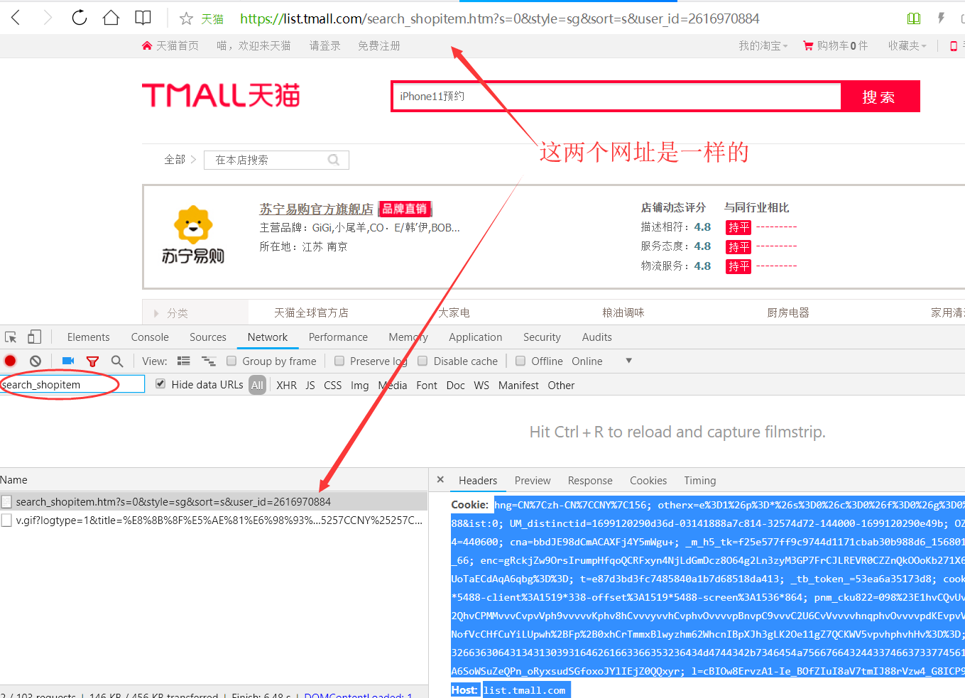 —>第二步:刷新一次页面(有滑块要滑成功),Filter框输入【search_shopitem】,找到跟网址一样的,选中,右边Headers拉下来,在Request Headers里面找到cookie,选中cookie的整段内容右键复制,然后到当前窗口点击“粘贴继续”;