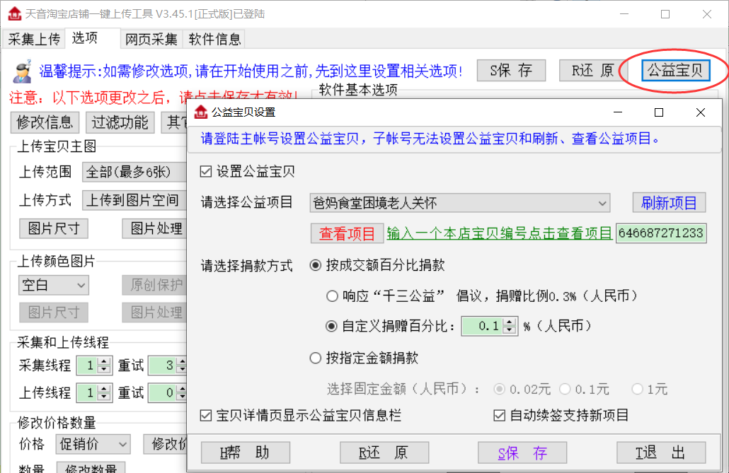 公益宝贝功能只支持主帐号,上传宝贝将会按照这里面的选项。刷新公益项目需要登陆主帐号,查看项目需要输入一个本店的宝贝编号。
