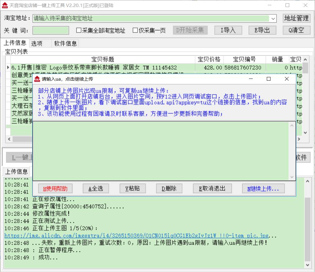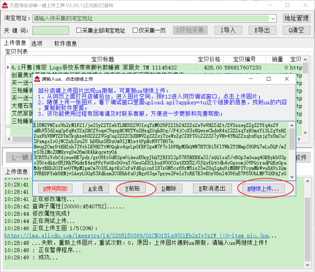 部分店铺上传图片出现ua限制,可输入ua点击继续上传,详细请看教程