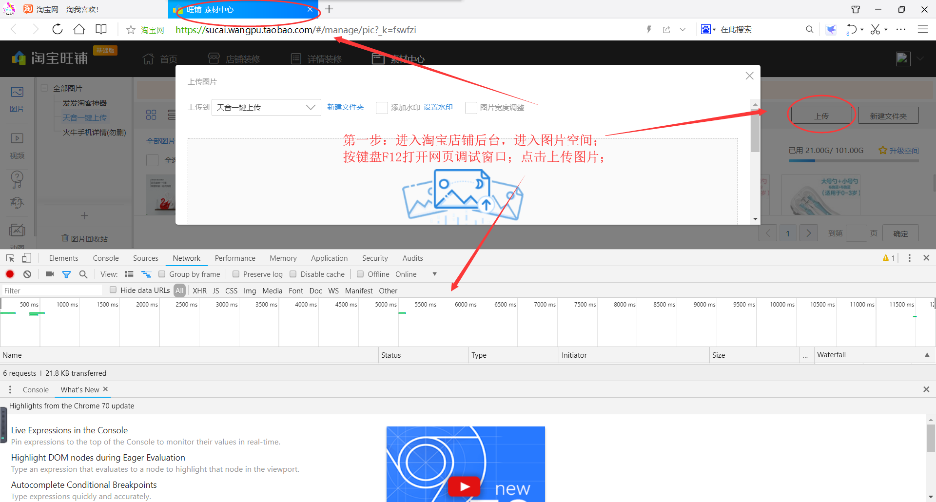 —>第一步:在网页上面打开店铺后台,进入图片空间,按F12进入网页调试窗口,点击上传图片