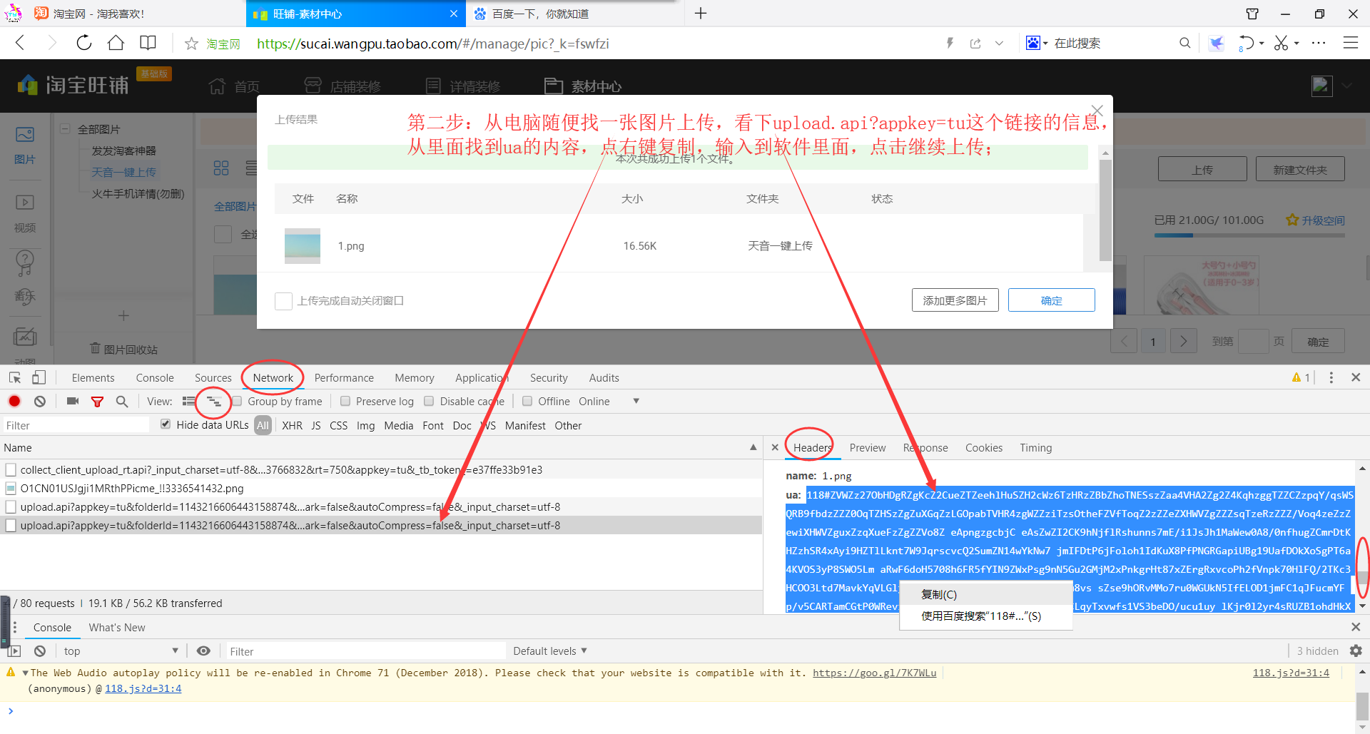 —>第二步:随便上传一张图片,看下调试窗口里面upload.api?appkey=tu这个链接的信息,找到ua的内容,复制到软件里面
