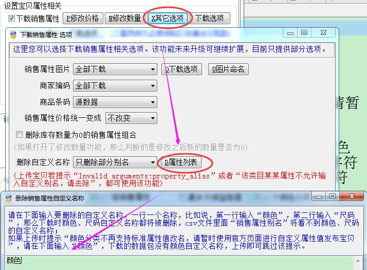 下载后导入助理,我们看到这个宝贝的颜色都是销售属性别名,如果下载后直接上传将出现“Invalid arguments:property_alias”报错。