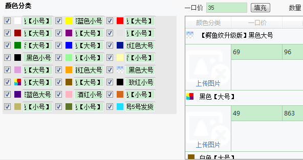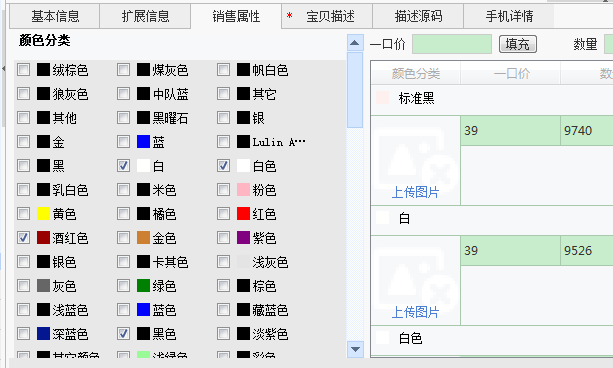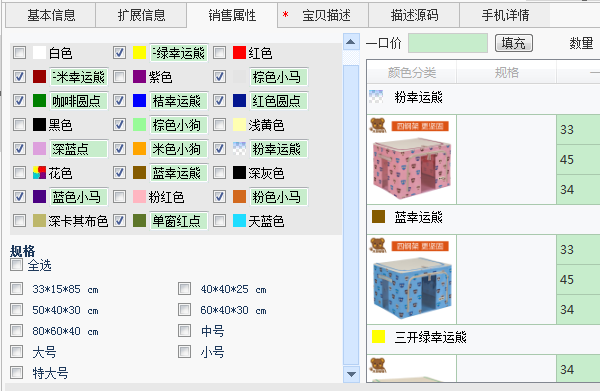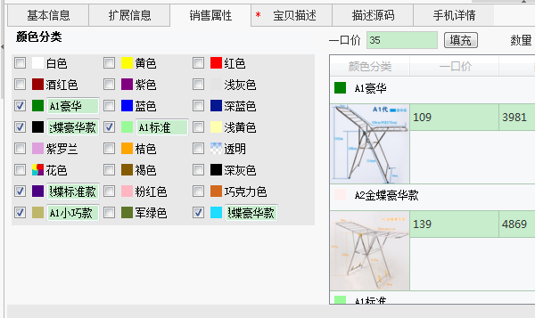 导入助理后,我们看到颜色齐全,但是规格全丢了,原因在于规格的编号变了,旧的编号跟新的没法一一对应,导致规格空缺。这个宝贝其实只要卖家稍微更新便可同步到最新的编号。